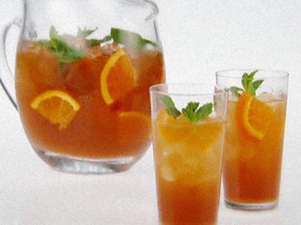 a água com gás na jarra e adicione as fatias de laranja. Despeje o chá em 4